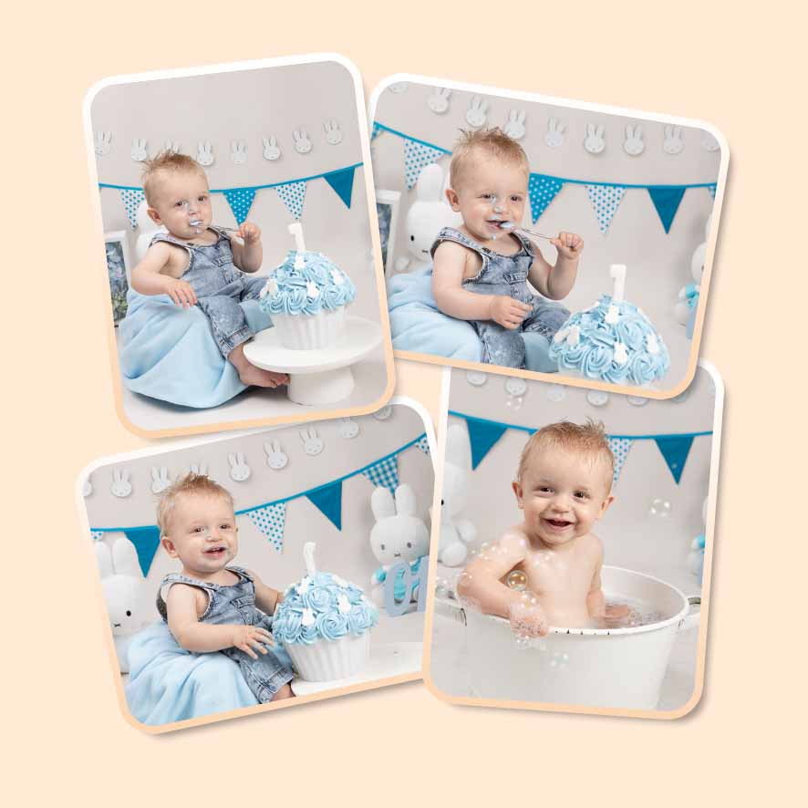 We beginnen met foto’s terwijl je kindje nog schoon is, in een mooie outfit. Daarna mag er losgegaan worden met de taart. De meeste kindjes zijn in het begin nog voorzichtig, omdat het nieuw voor hen is. Maar met een beetje hulp ontdekken ze al snel hoe leuk het is om zelf aan de slag te gaan. Tot slot mag je kindje spetteren in een warm badje met schuim, zodat de dag echt feestelijk eindigt.